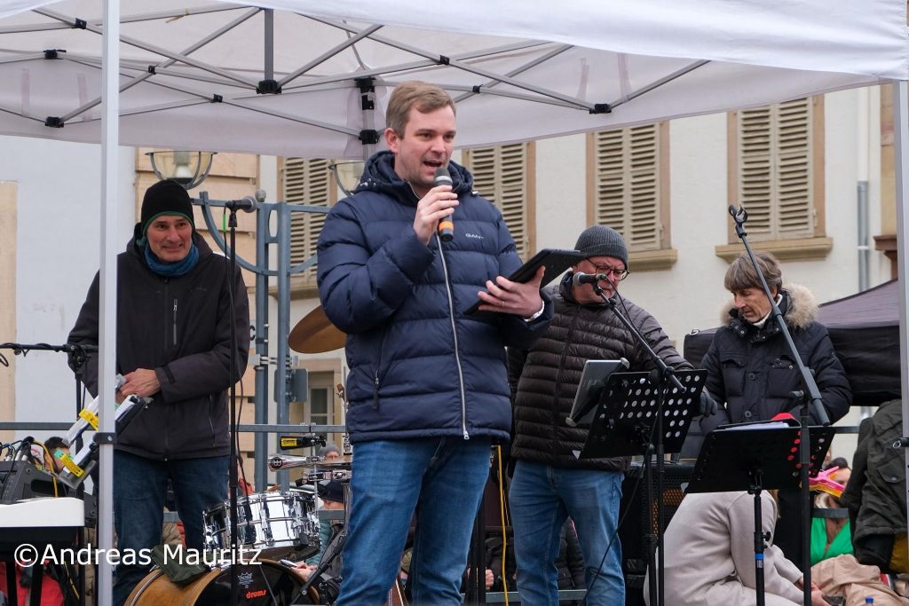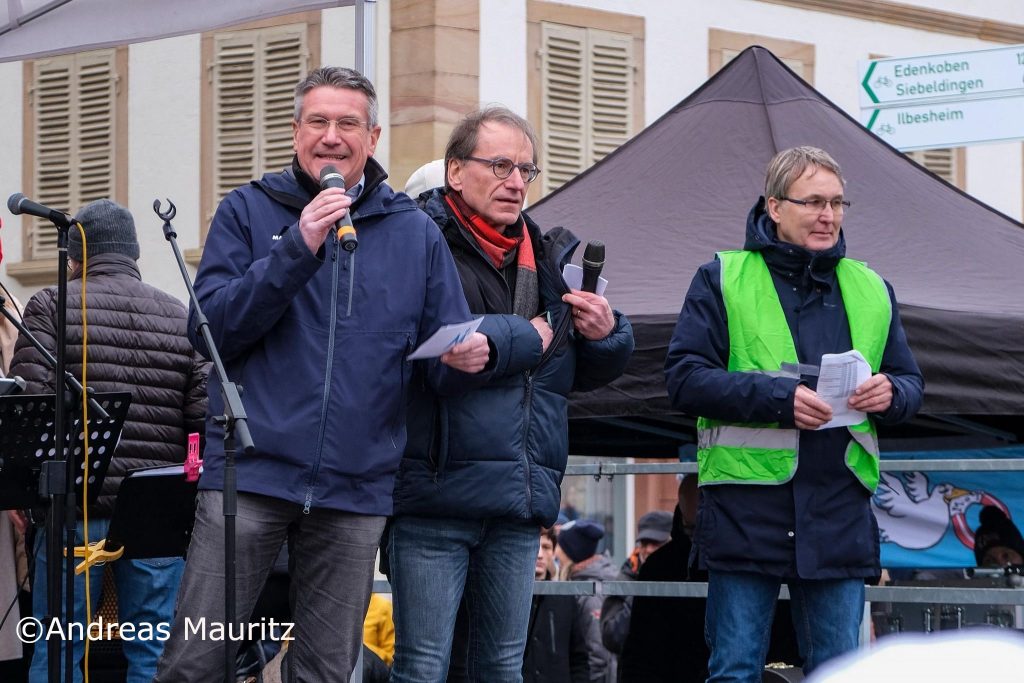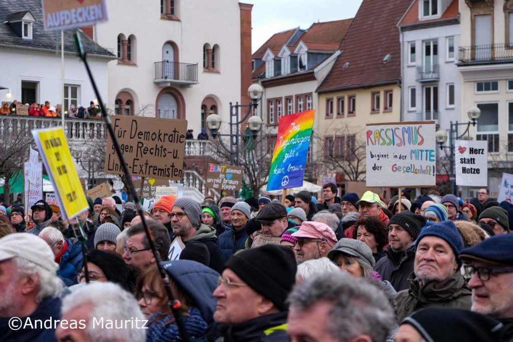 Bei der abschließenden Kundgebung vor der evangelischen Kirche betonte die Versammlungsleitung wie wichtig es ist nicht nur einmalig zu demonstrieren, sondern jeden Tag die rechte Welle zu brechen. Anhand eines persönlichen Beispiels wurde gezeigt, wie steter Tropfen den Stein höhlt und Menschen aus den Händen der Parolen rechter Rattenfänger befreit werden können. Anschließend ging es weiter in der Kirche. Nach der Gründung des neuen Annweilrer Vereins „Menschenwürde, Toleranz und Demokratiebildung Annweiler“ diskutierten in zwei Runden zuerst Vertreter aus der Zivilgesellschaft und anschließend Vertreter der Kommunal- und Landespolitik auf dem Podium zum Thema „Krise der Demokratie? Weltweite Krisen und deren Auswirkungen auf das politische Handeln“, moderiert on unserem Verstandsmitglied Björn Eisenmann