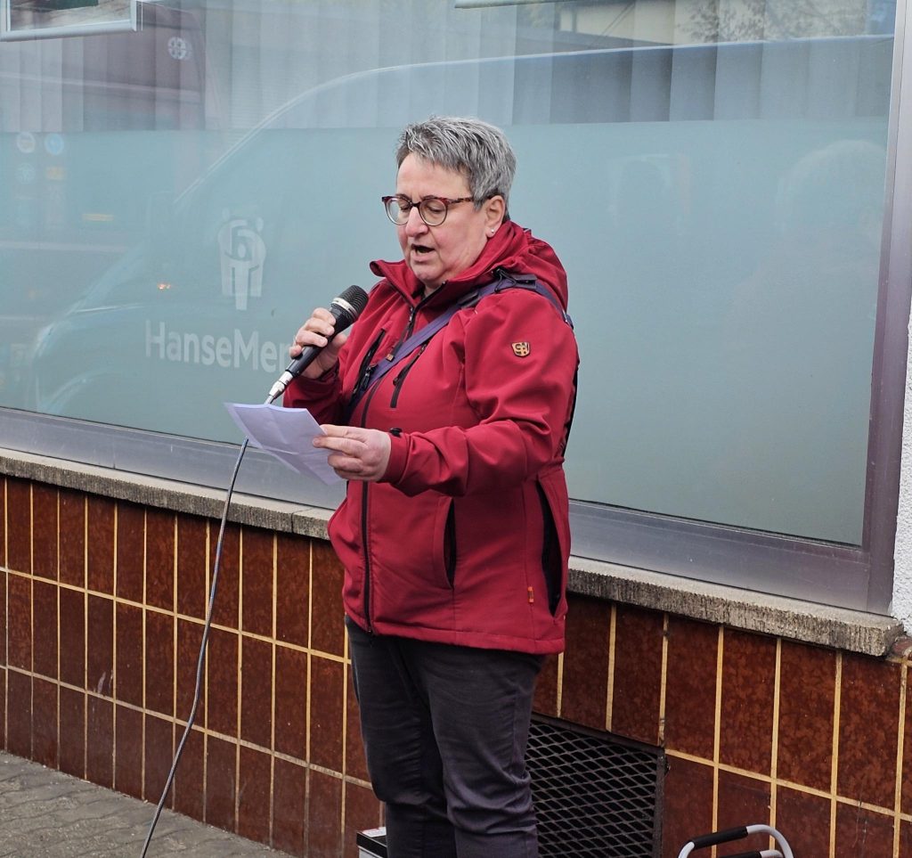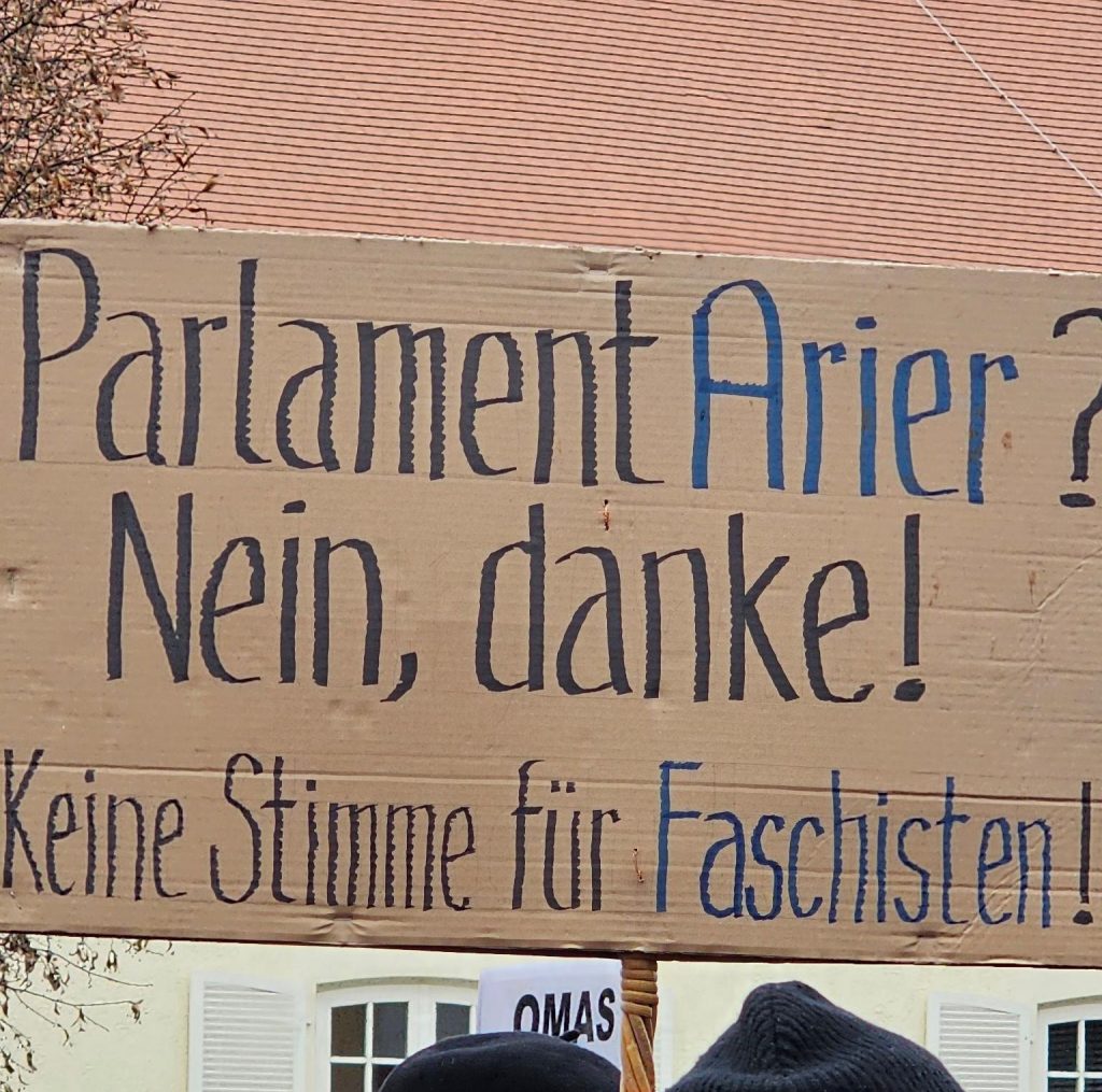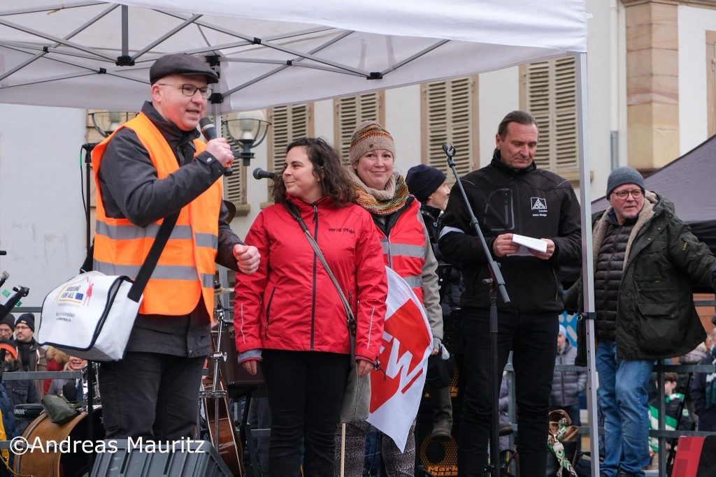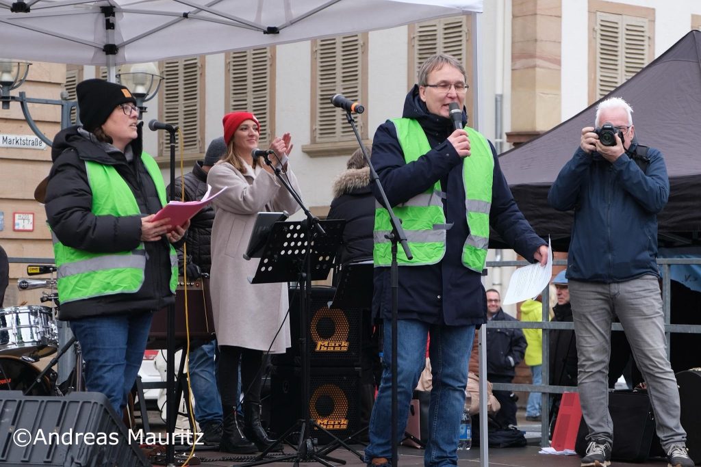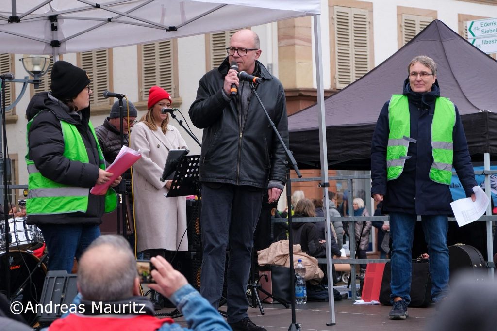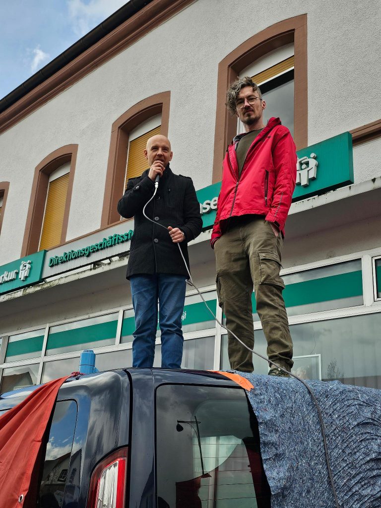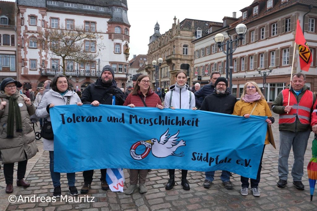 Mit der Eröffnung und der Begrüßung durch unsere erste Vorsitzende Tanja, Sebastian von ver.di und unserem Bündniskoordinator Björn machten wir von Anfang an deutlich, was der Konsens des Tages sein wird: Wir sind laut, wir sind bunt, wir sind solidarisch und wir sind friedlich. Dies fand bei den Menschen, die in Annweiler zusammenkamen, breite Annahme. Menschen auf der Kundgebung waren bunt durchmischt: Annweilerinnen, die sich gegen rechte Hetze in ihrer Stadt stellten, Gewerkschaften, Lokalpolitikerinnen, Kirchen, die Omas gegen Rechts, das Offenen Antifaschistischen Treffen Landau und weitere, Antifaschistinnen bilden einen stellvertretenden Ausschnitt der Breite des Teilnehmenden. Zu unserer großen Freude bezogen die Menschen lautstark vor dem Hohenstaufensaal Stellung gegen Rechts. Offensichtlich war das für Tino Chrupalla schon ausreichend um sich, wie wir Presseinformationen entnehmen konnten, durch einen Keller hat in den Hohenstaufensaal eskortieren zu lassen. Nachdem wir alle gemeinsam dem Stadtrat der kleinen Stadt Annweiler und der Stadtspitze für ihren Mut, bis zuletzt wie “Löwenbezwinger” gekämpft zu haben, lauten und donnernden Applaus spendeten richtete Benjamin Burckschat, der erste Beigeordnete ein Grußwort die Menschen, die zusammengekommen waren. Ihm folgte ein kurzer Redebeitrag von Christiane Huber aus dem Stadtrat, stellvertretende Fraktionsvorsitzende der lokalen SPD-Stadtratsfraktion. Ein Antrag aus ihren Reihen sorgte dafür, dass die Stadt sich gegen die Vereinnahmung der in weiten Teilen rechtsextremen Partei erhob. Pfarrer Thomas Lang erinnerte daran, dass Hass nie gut sei. Einen emotionalen Höhepunkt Setzte Sabine von den Omas gegen Rechts, die sich mit ihre über 80 Jahren nicht zu schade war und keine Mühe scheute, um sich auf den Kleintransporter des AStA Landau zu quälen, der als Bühne diente. Von dort berichtete sie eindrucksvoll unter anderem von ihren eigenen Fluchterfahrungen zu berichten. Anschließend hatte David Rosenberg, der in der Vorwoche nur eingespielt werden konnte, das Wort. Als Vorsitzender des jüdischen Studierendenverbands Hinenu Rheinland-Pfalz und Saarland gab er uns einen Einblick in die jüdische Perspektive. Dass die Gewerkschaften jeglichen Widrigkeiten trotzen, demonstrierte Nils von der IG BCE. Trotz einsetzenden Sturms, kurzzeitigem Starkregens und Hagels ergriff er das Wort und betonte, wie Sozialabbau die Rechten beflügelt. Nach ihm hielt eine Aktivistin des OAT Landaus ihren Redebeitrag in dem Sie unter anderem auf Polizeigewalt und juristische Repressionen gegen Linksaktivistinnen aufmerksam machte und die Politik der Ampelregierung aber auch der Unionsparteien, wie bereits ihr Vorredner, kritisierte. Während ihres Vortrages kam es zu Störungen und Zwischenrufen, von denen wir uns als Verein für Toleranz und Menschlichkeit Südpfalz distanzieren. Demokratischer Diskurs kann nur unter Einhaltung einfachster Regeln des gesellschaftlichen Miteinanders funktionieren. Forderungen einer Rednerin das Mikrofon auszuschalten, lautstarkes überbrüllen, gehören hier ganz klar nicht dazu. Wir verurteilen solches Verhalten klar und distanzieren uns hiervon deutlich! Selbstverständlich werden wir die Vorkommnisse aufarbeiten, um in Zukunft besser darauf reagieren zu können. Gleichzeitig möchten wir betonen, dass es Menschen gab, die sowohl auf uns als auch auf die Aktivistin zukamen, um das Gespräch zu suchen und in einen konstruktiven Dialog gingen. Wir ermutigen Menschen so zu handeln. Demokratie heißt verschiedene Meinungen zu haben, darüber zu reden, ja auch zu streiten aber bitte in einem konstruktiven Rahmen. Abschließend machte Silke als Verdi-Vertreterin in ihrem Redebeitrag deutlich, warum die AfD eben keine Partei für „kleine Menschen”, keine Partei für Arbeiterinnen ist.