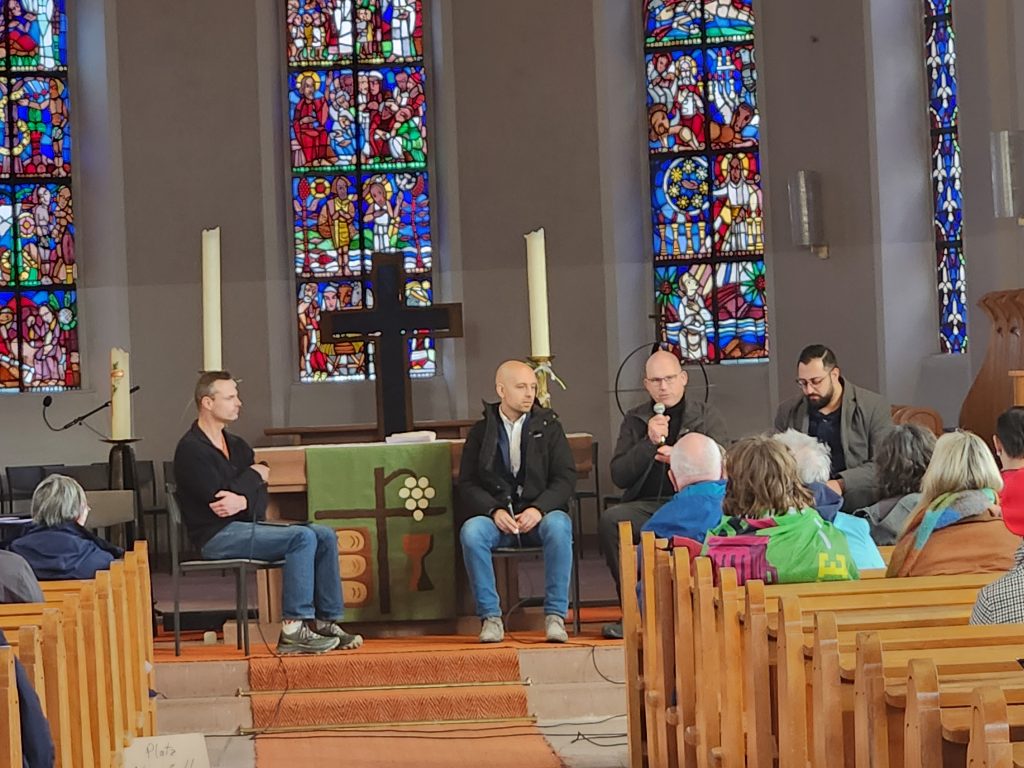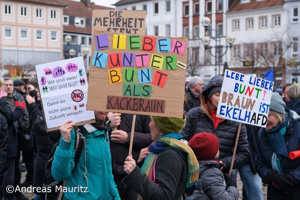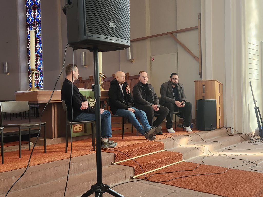 Bei der abschließenden Kundgebung vor der evangelischen Kirche betonte die Versammlungsleitung wie wichtig es ist nicht nur einmalig zu demonstrieren, sondern jeden Tag die rechte Welle zu brechen. Anhand eines persönlichen Beispiels wurde gezeigt, wie steter Tropfen den Stein höhlt und Menschen aus den Händen der Parolen rechter Rattenfänger befreit werden können. Anschließend ging es weiter in der Kirche. Nach der Gründung des neuen Annweilrer Vereins „Menschenwürde, Toleranz und Demokratiebildung Annweiler“ diskutierten in zwei Runden zuerst Vertreter aus der Zivilgesellschaft und anschließend Vertreter der Kommunal- und Landespolitik auf dem Podium zum Thema „Krise der Demokratie? Weltweite Krisen und deren Auswirkungen auf das politische Handeln“, moderiert on unserem Verstandsmitglied Björn Eisenmann