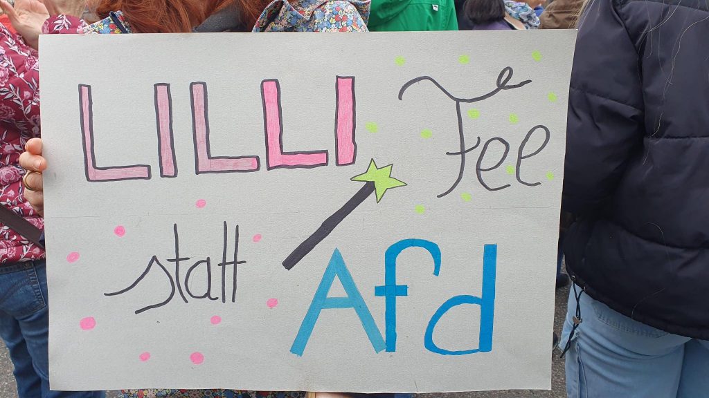 Nach einer kurzen, musikalischen Pause formierte sich unser Demonstrationszug zur evangelischen Kirche, bevor die AfD- Veranstaltung beendet war, da wir uns unsere Demonstration nicht von der AfD vorschreiben lassen. Wir trafen und begrüßten auf dem Rathausplatz die “Kidical Mass” Tour.